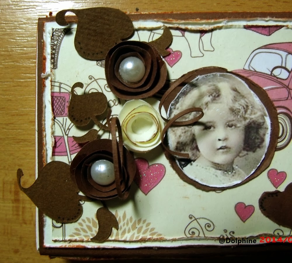 Ich hab mal wieder meine Lieblingsspiralblumen gemacht und die beiden braunen haben weiße Halbperlen als Mittelpunkt bekommen. Dazu mit dem Röbi ausgeschnittene Blätter , gestanzte Herzen und Spiralen aus braunem Tonpapier. Dazu ein Vintagbild, welches es als freies Bild im Internet gibt.